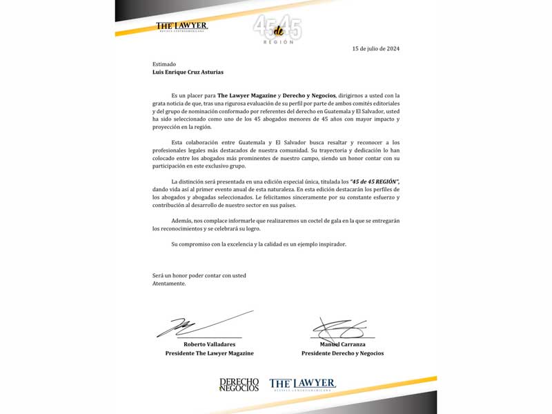 Es un honor recibir esta excelente noticia y ser reconocido como uno de los 45 profesionales menores de 45 años con mayor impacto y proyección en la región. Agradezco a las revistas guatemalteca y salvadoreña The Lawyer Magazine y Derecho y Negocios por este reconocimiento.